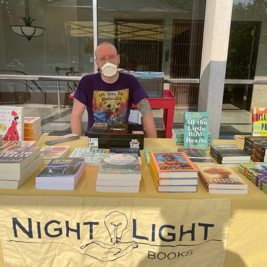 Patrick Antenucci (he/him): A recent Clevelander but Northeast Ohio native, Patrick graduated from Youngstown State University with his Bachelor’s in English. Working at a used bookstore in 2020 was a revelation in two ways: he loved connecting customers with books and hated having a boss. Realizing the paucity and under consideration of disability lit, he founded Nightlight Books in 2023, transitioning it to a co-op enterprise in 2024. Favorite types of books include genre bending short stories that scoff at easy categorization, fantasy tomes with vertigo inducing lore drops, pop culture criticism of the mishmash variety, and, of course, disability justice essay collections.